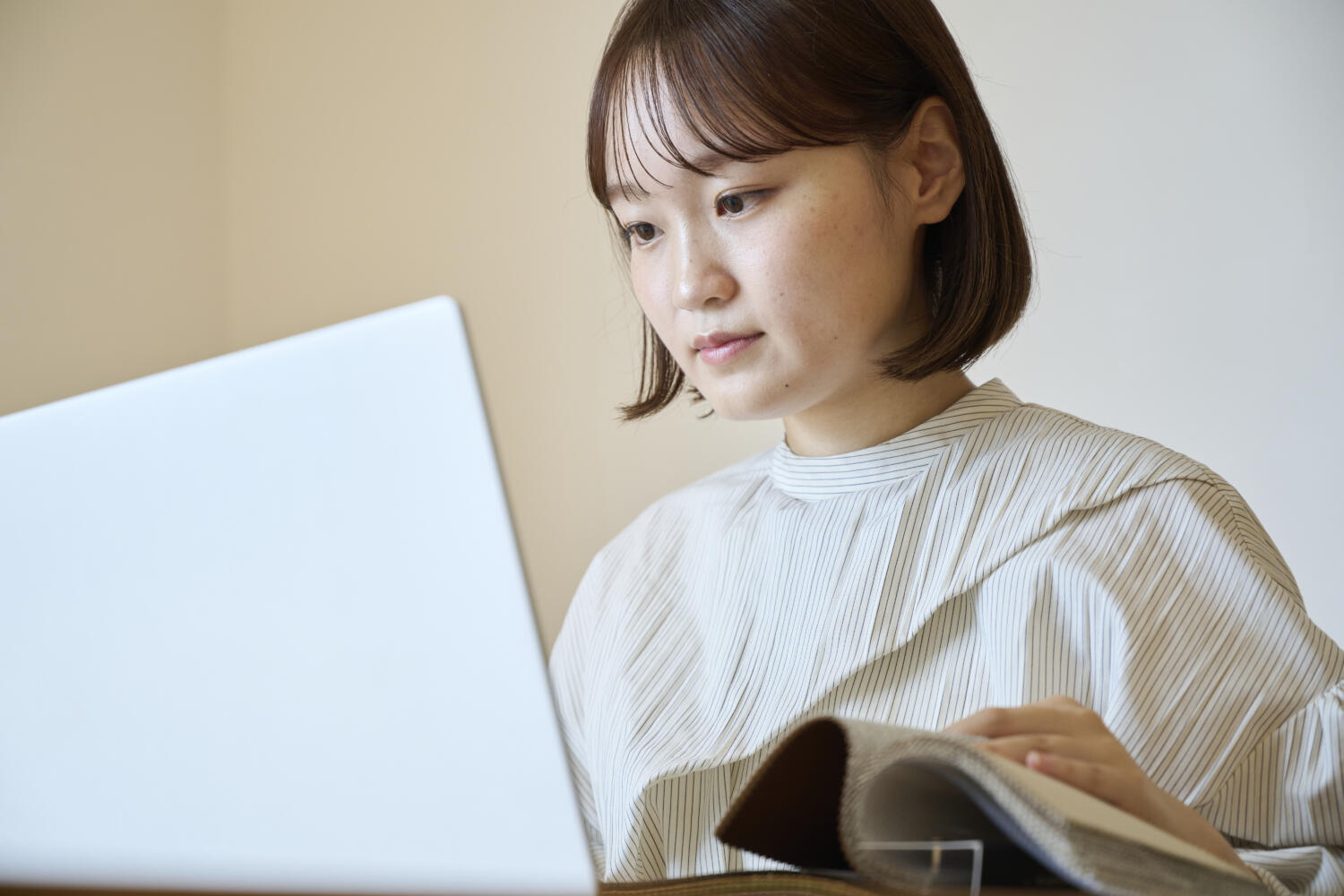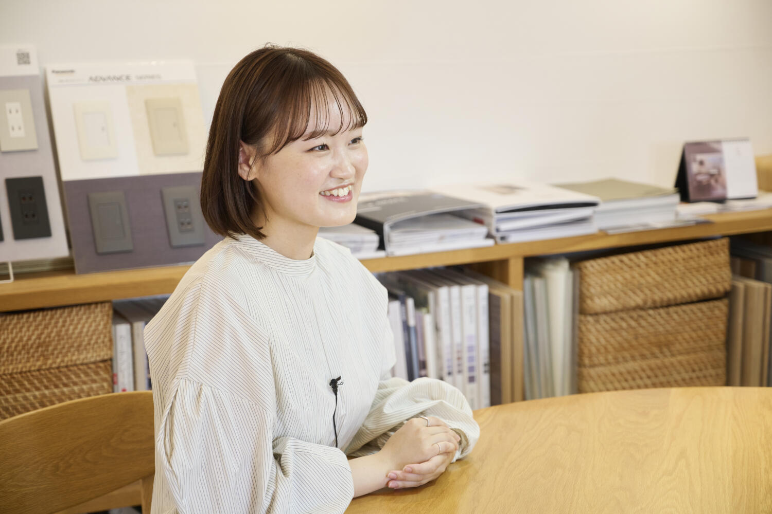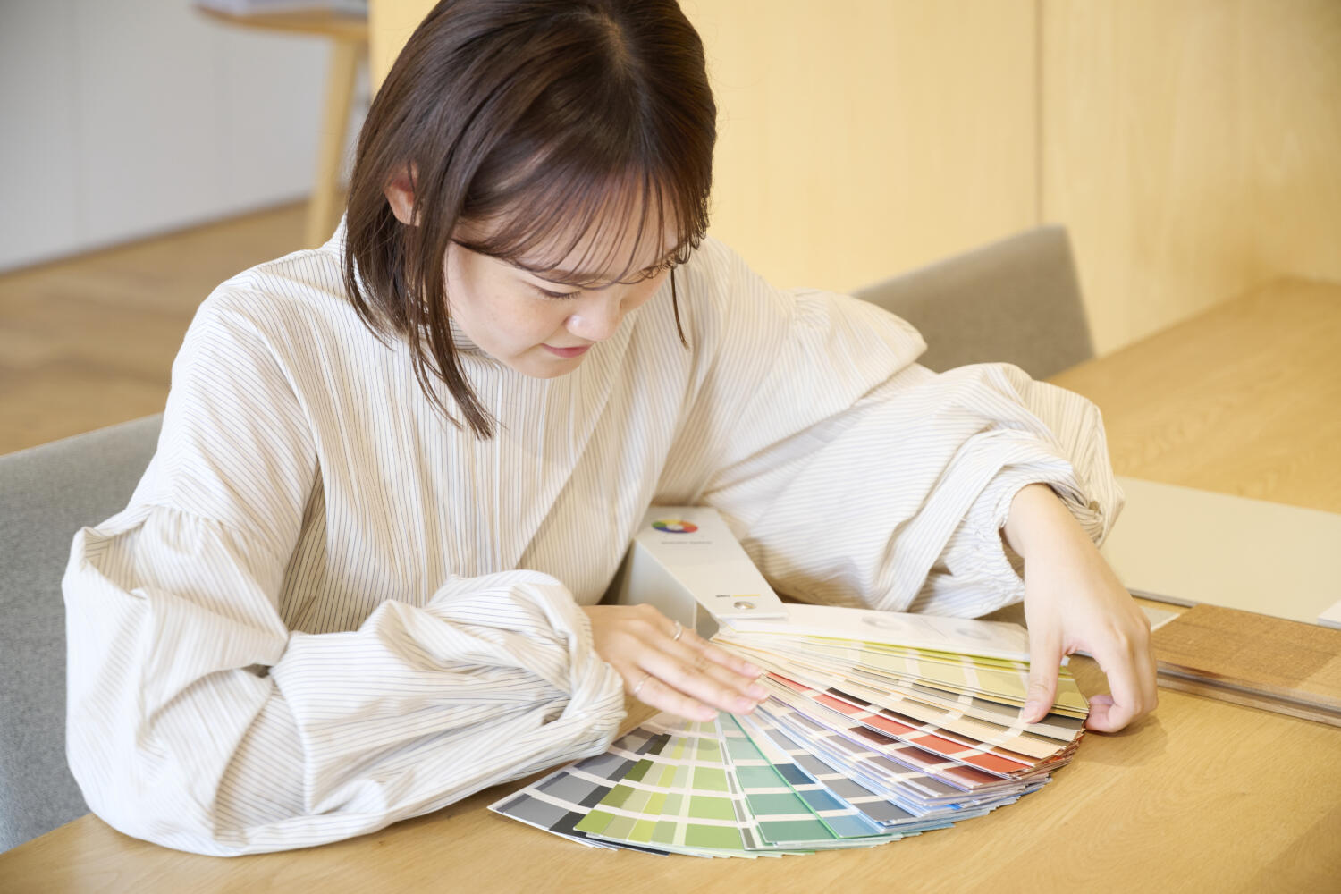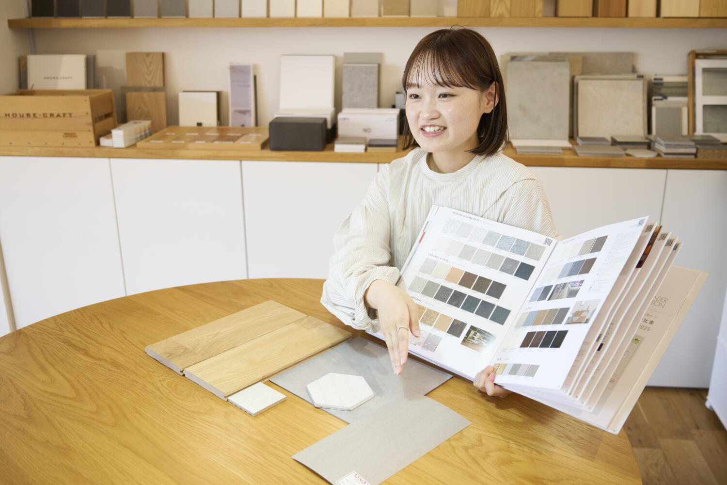 設計部スタイリスト課で、お客様のお家の内装やインテリアをトータルでコーディネートする仕事をしています。具体的には、壁紙や床材、照明、家具、カーテンなどを、お客様の理想の暮らしに合わせて提案します。