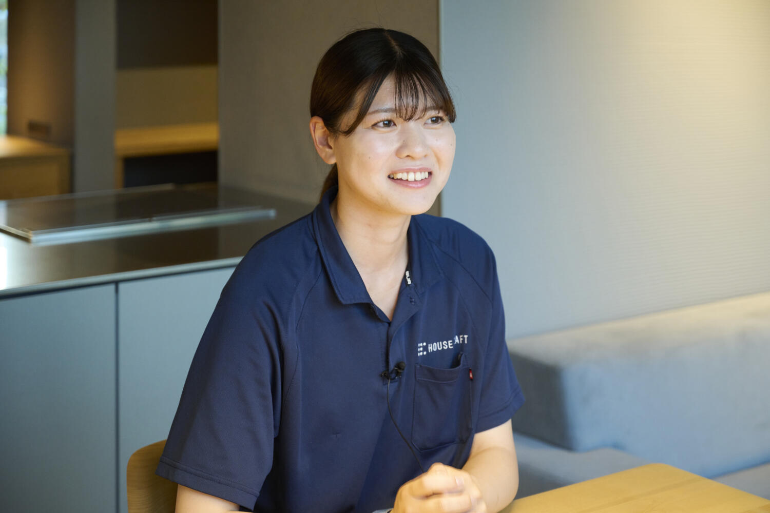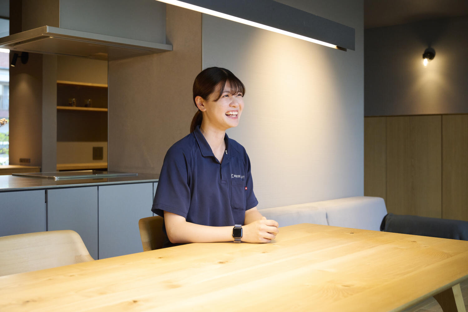 就職活動では、ビル建設やカーテン業界など幅広く見ていました。ハウスクラフトのインターンシップに参加したのは、そんな時です。そこで感じたのは、社員の皆さんの雰囲気の良さ。特にスタイリストの先輩お二人の楽しそうなやりとりを見て、「この人たちと働きたい!」と強く感じました。