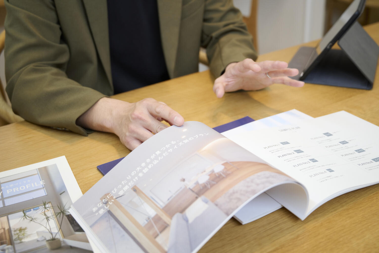 菰野スタジオの店長として、アドバイザーの仕事をしています。アドバイザーは、お客様との最初の出会いからお家が完成するまで、家づくりの全行程に寄り添う伴走者のような存在です。お客様がどんな暮らしをしたいのかをじっくりヒアリングし、理想の住まいを形にするための図面提案や資金計画のサポートを行います。
